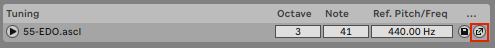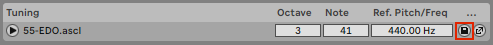 To correct this, you can try to determine the reference pitch used by that tool and adjust the reference pitch used in Live via the tuning UI. You can also do this “by ear”, and simply tweak the reference pitch in Live until it matches the tuning in the other tool. Once you’ve corrected the reference pitch, you can export your tuning from Live as a .ascl file so that you don’t need to repeat these steps every time you use that tuning in Live – the tuning will be exported as a .ascl file containing the custom reference pitch you set. Just click the Save icon in the tuning UI.