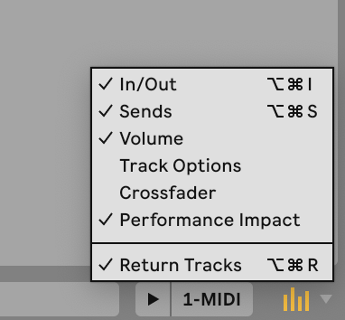 - Click the Mixer view control at the bottom right corner of Live's window to expand or collapse the Mixer in either Session or Arrangement View. Using the drop-down menu next to the toggle, you can show or hide Inputs / Output, Sends, Volume, Track Options, Crossfader, Performance Impact, and Return Tracks.