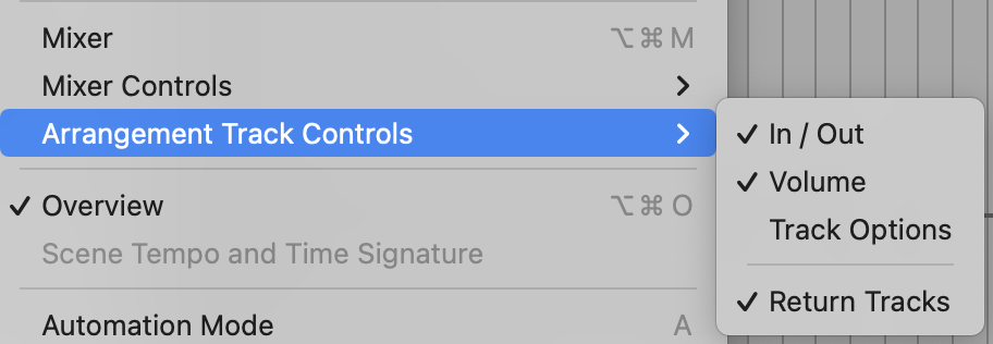 You can find show/hide options for track controls and return tracks in Live’s View Menu, under Arrangement Track Controls.