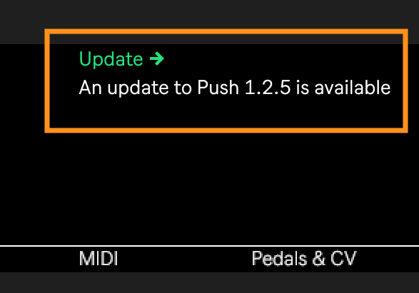 For more information on updating Push (standalone) software, visit Setting up Push (standalone): Update Software. - Use the upper display button to press Upgrade. Push will prompt you to confirm that you’d like to upgrade.