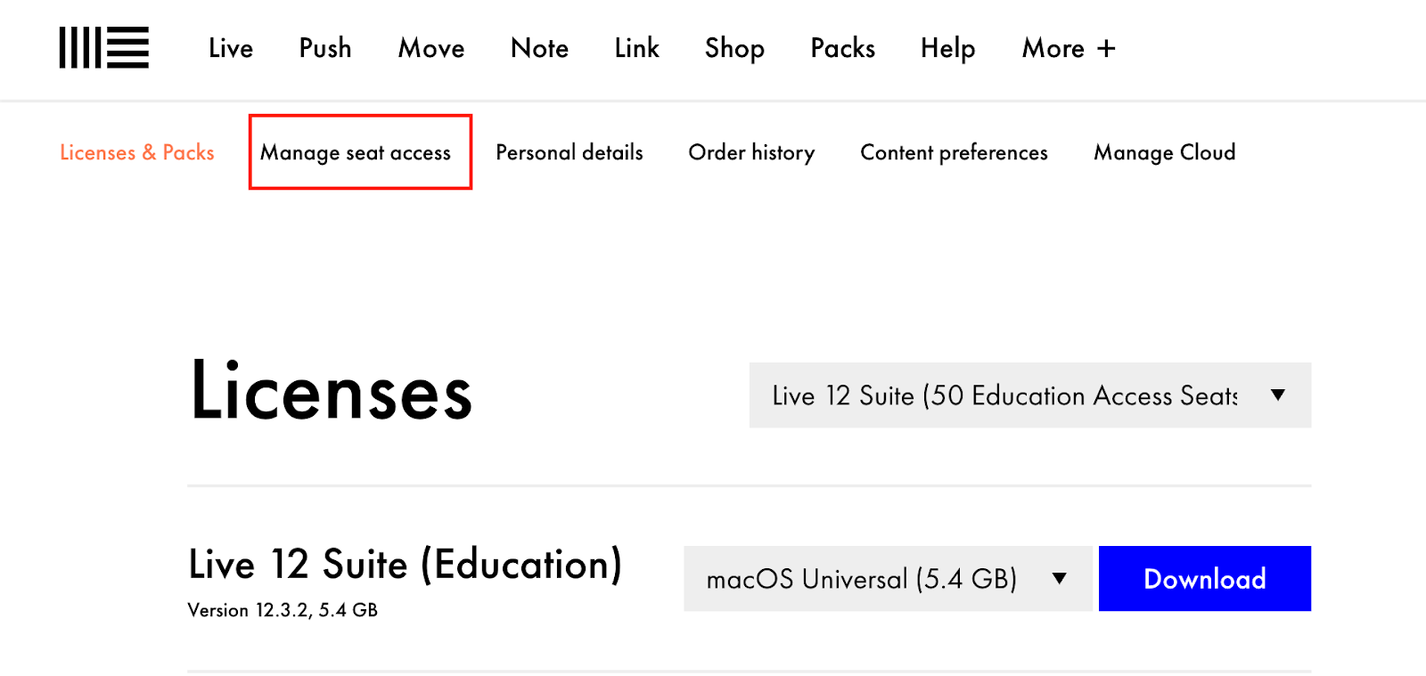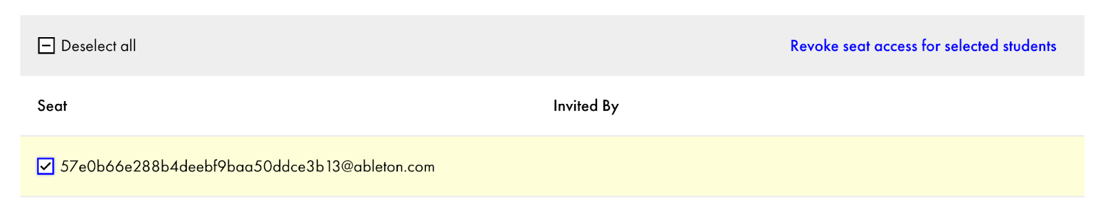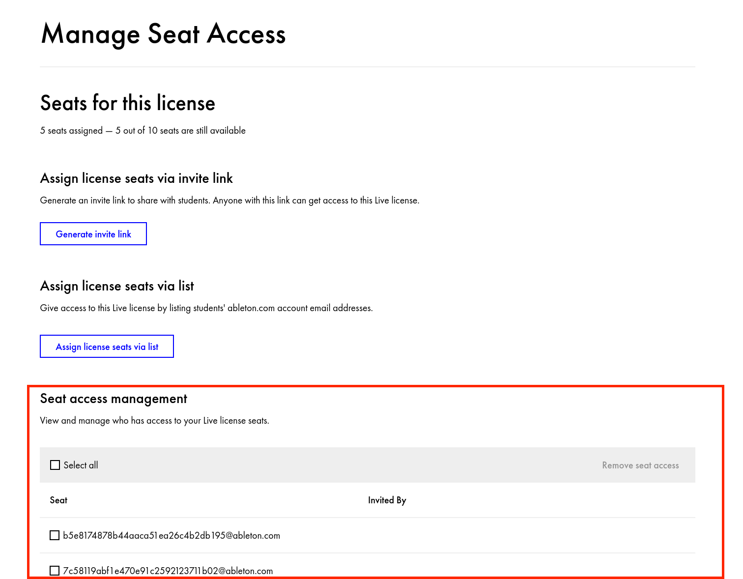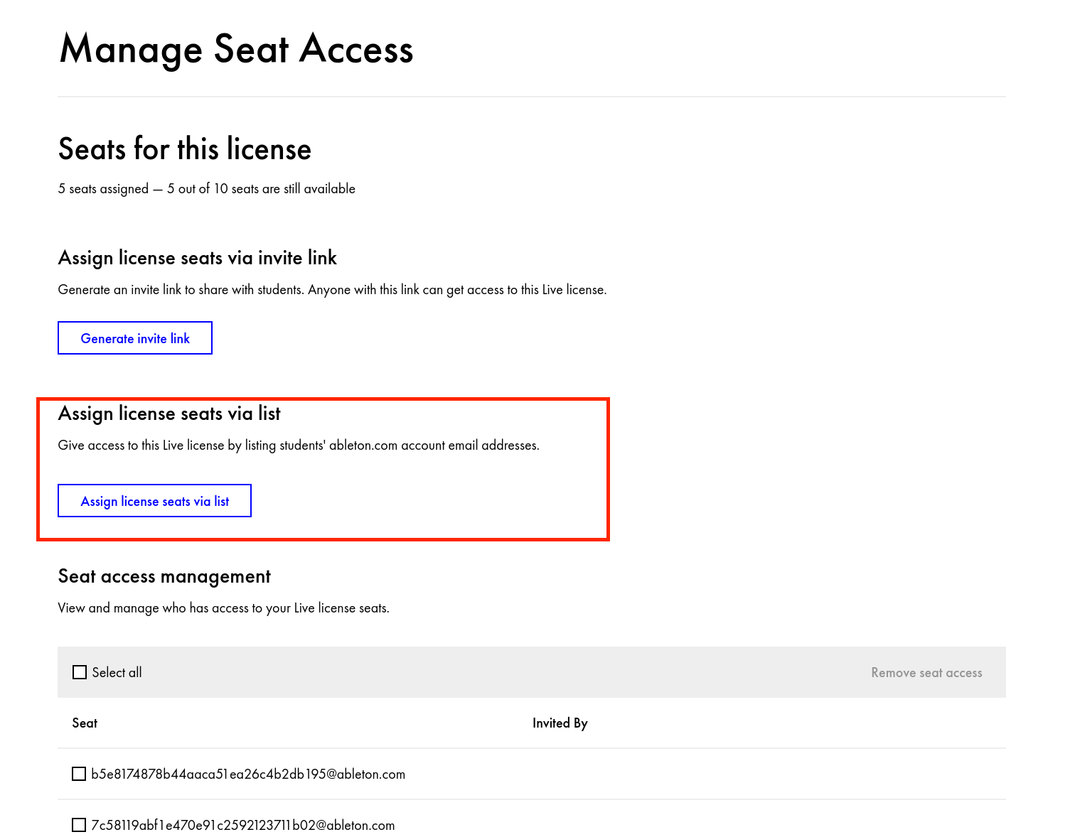 Assigning individual license seats can be done via invite link or by entering a list of the student Ableton.com account emails to which the seats will be assigned. Both of these methods of license seat administration can be found on the Manage Seat Access section of the Ableton.com Account page.