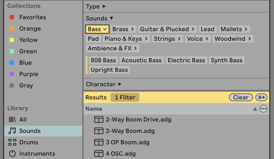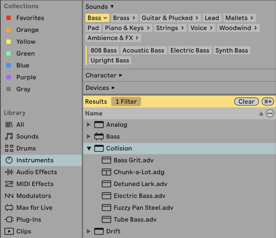 Para ver contenido ordenado por dispositivo Live, seleccione Instrumentos en la sección Librería. A continuación, seleccione uno o varios filtros en el grupo de filtros Sonidos. Los resultados están agrupados bajo el respectivo dispositivo.