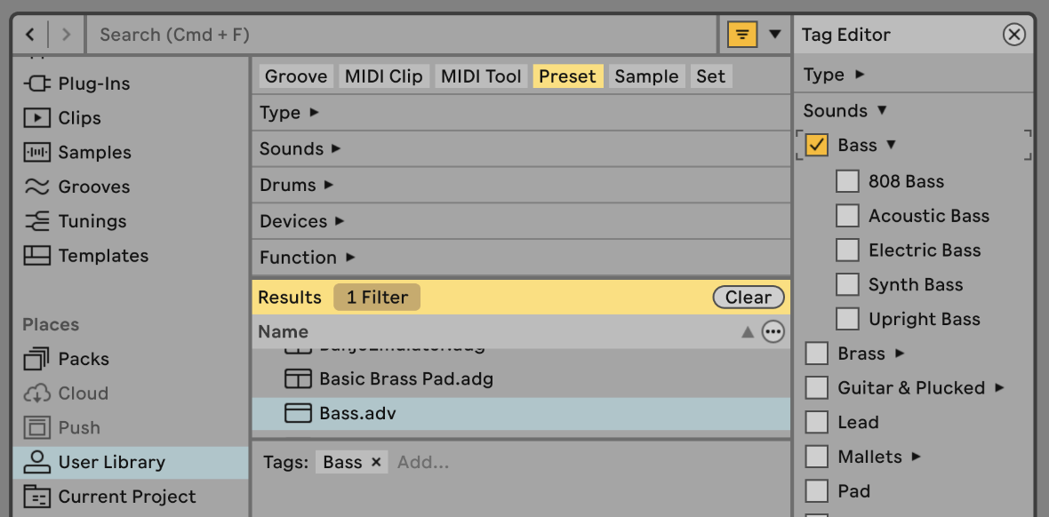 Cuando realizas una búsqueda no filtrada usando una palabra clave, los resultados incluirán todos los elementos relevantes, independientemente de su categorización, ya sean muestras, dispositivos o presets. Para limitar los resultados a presets, dispositivos, muestras live, plantillas, etc., elija una etiqueta en la barra lateral del navegador, o un filtro en Vista de filtro.
