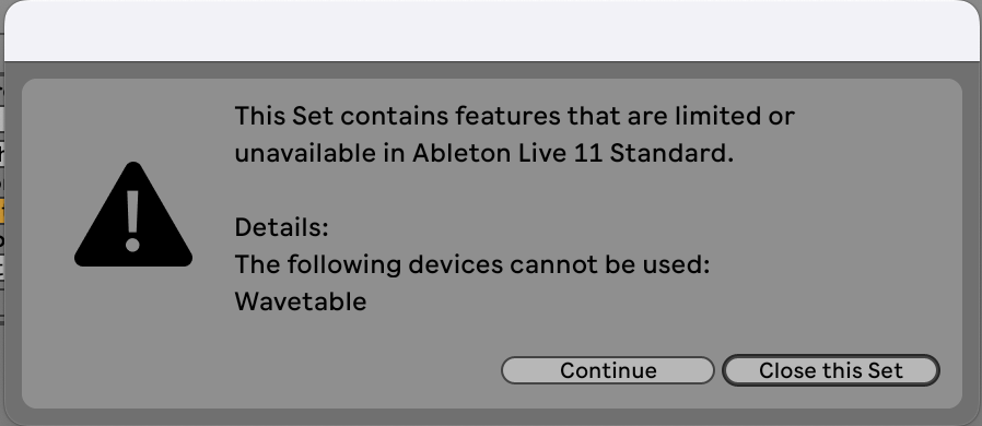 Los Live Sets creados en la versión de prueba de Live pueden abrirse en cualquier edición adquirida de Live del número de versión equivalente (por ejemplo, Live 12.1) o superior. Sin embargo, si el Set contiene una función
