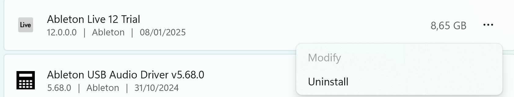 Vaya a Inicio → Configuración → Aplicaciones → Aplicaciones instaladas. Busque la aplicación Live Trial y haga clic en el menú de tres puntos, luego seleccione Desinstalar: