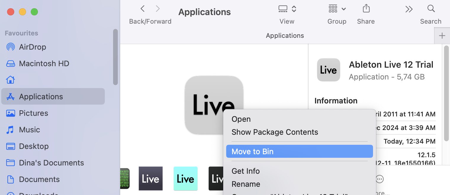 Arrastre la aplicación Live Trial a la papelera o haga clic derecho en el ícono Live Trial y seleccione Mover a la papelera.