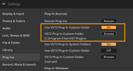 • Para evitar problemas al acceder a sus plug-ins en Live, instale los dispositivos VST2 y VST3 en la unidad del sistema (C:).