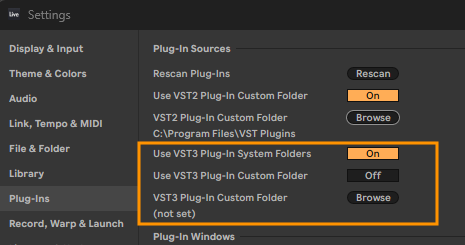• La ruta C:\Program Files (x86)\Common Files\VST3 está dedicada a plug-ins VST3 de 32 bits en Windows de 64 bits, los cuales no son compatibles a partir de Live 10.