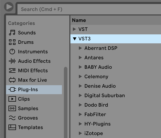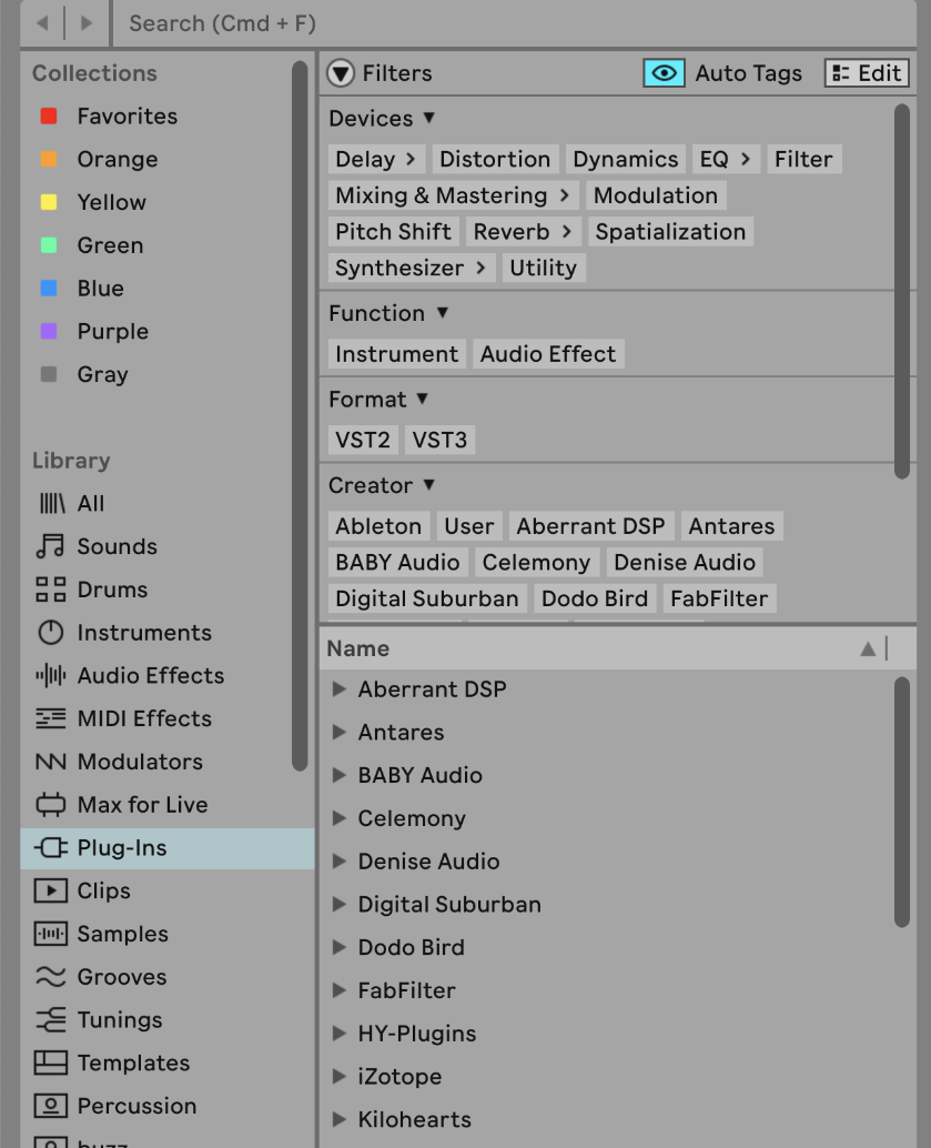 Una vez que Live haya terminado de escanear los plug-ins, aparecerán en el navegador de Live como se muestra a continuación. Luego puede arrastrar y soltar dispositivos en su Set de Live.