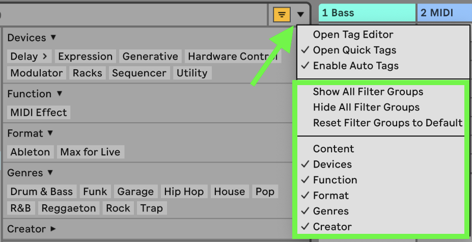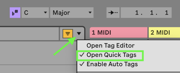 Dans Live 12, le contenu du navigateur est pré-taggé pour en faciliter l’identification. Pour personnaliser les tags selon votre workflow, ouvrez l’ Éditeur de tags en cliquant sur la flèche en haut à droite du panneau des filtres.