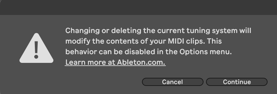 Liveセットのチューニングシステムが削除または変更されると、既存のMIDI ノートは同じピッチを生成しなくなります。 Liveには、この状況に対処する2つのオプションがあります。 オプションメニューの[チューニングシステムのロード時にセットを再チューニング]が有効になっている場合、既存のクリップ内のMIDIノートは、新しいチューニングシステム内のピッチが最も近いノートに移動されるか、削除されます。 これは非破壊的な編集でないため、ポップアップで警告されます。