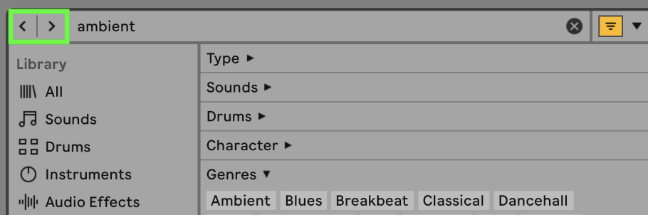 するには、Liveのウィンドウ左上にあるブラウザアイコンを展開するか、[CMD/CTRL + ALT + B]のキーコマンドを使用します。