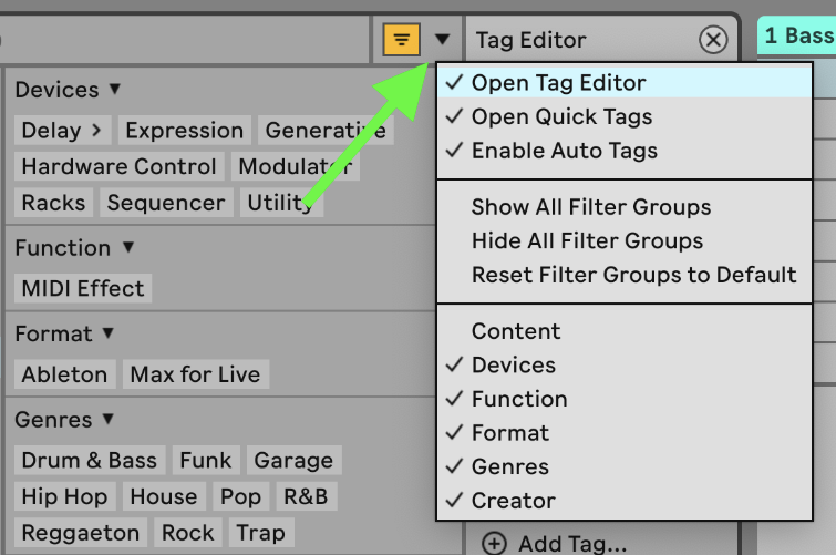 Live 12 では、ブラウザのコンテンツは簡単に識別できるように事前にタグ付けされています。 ワークフローに合わせてタグをカスタマイズするには、フィルター ペインの右上にある矢印を使用して タグ エディター を開きます。