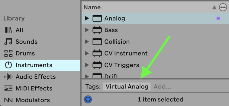 ライブラリ セクションは、Live のバージョンに応じて、 サウンド 、 ドラム 、 インストゥルメント 、 プラグイン などのラベルに分類されており、デバイス、インストゥルメント、プリセット、サンプルにアクセスできます。 ラベルを選択すると、その内容がアルファベット順に表示されます 。