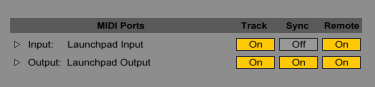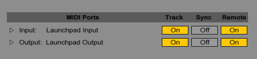 が正しく設定されていることを確認します。 LaunchpadのMIDIポート入力(Input)とMIDIポート(Output)で、[トラック]と[リモート]を有効にします。