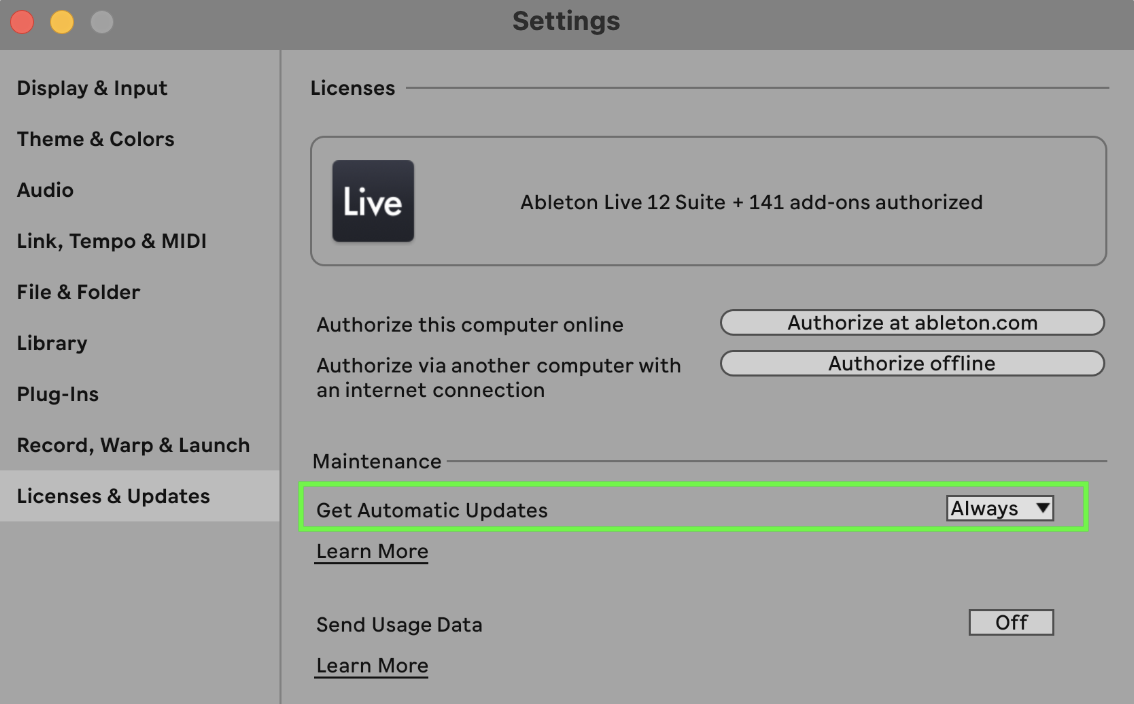如需从 Live 11.0.x 更新,必须通过 Ableton.com 手动安装当前版本。如果您安装的版本为 Live 11.0.12 或更早,即使在 Live 的设置中启用了自动更新,Live 11.1 或更高版本也不会自动更新。请登录您的 Ableton 账户,获取下载链接并 安装 当前版本的 Live。